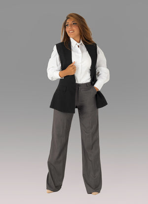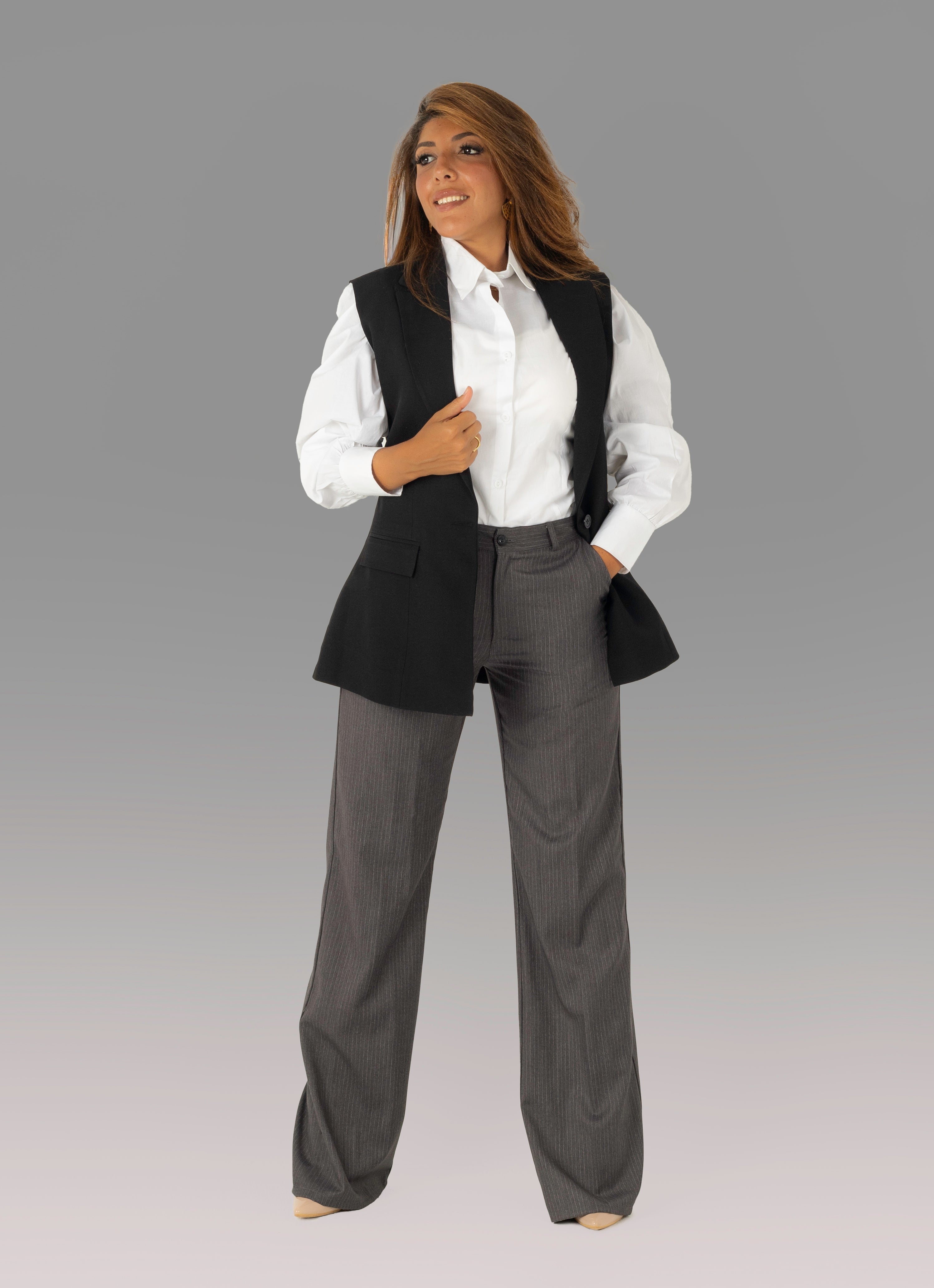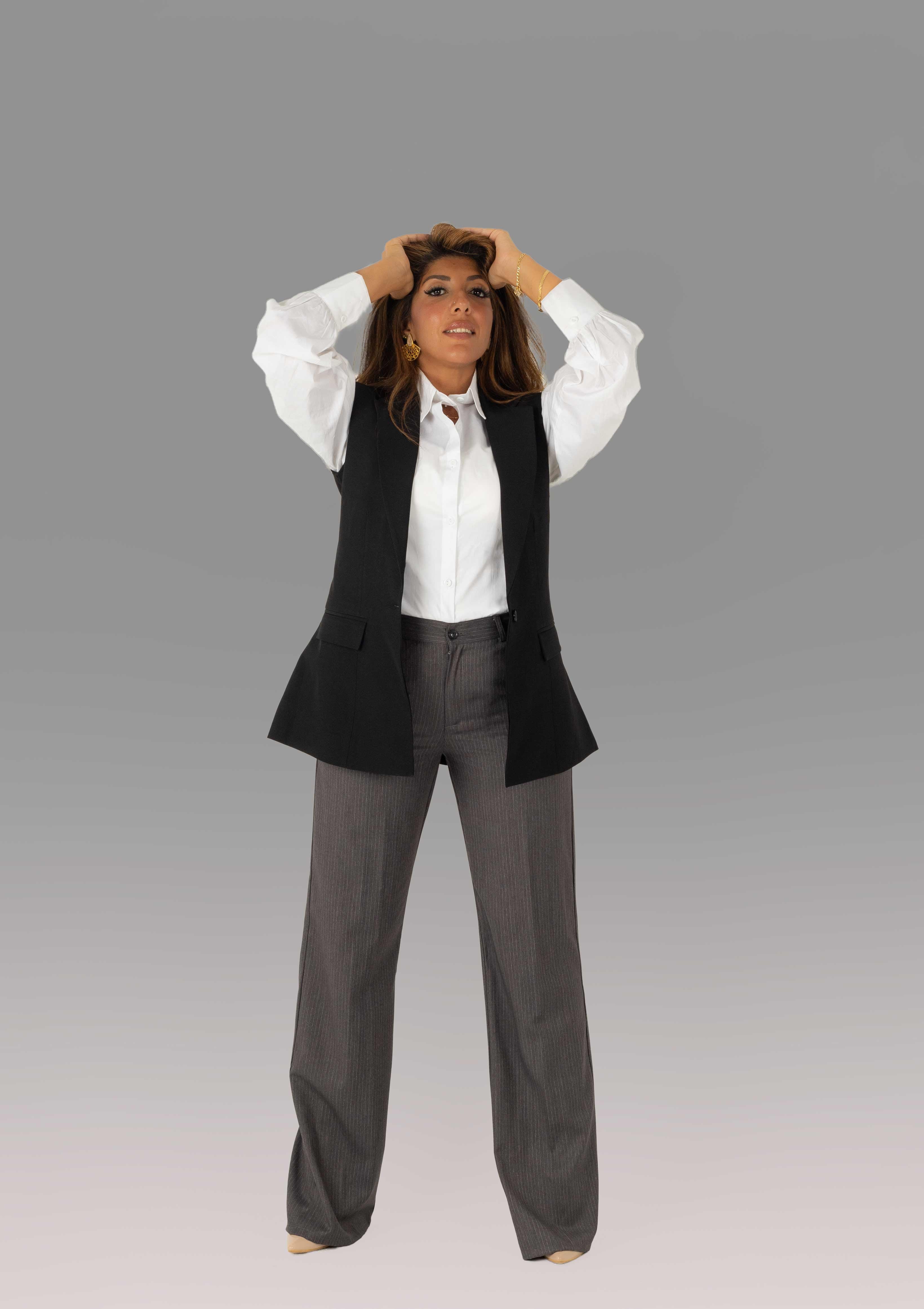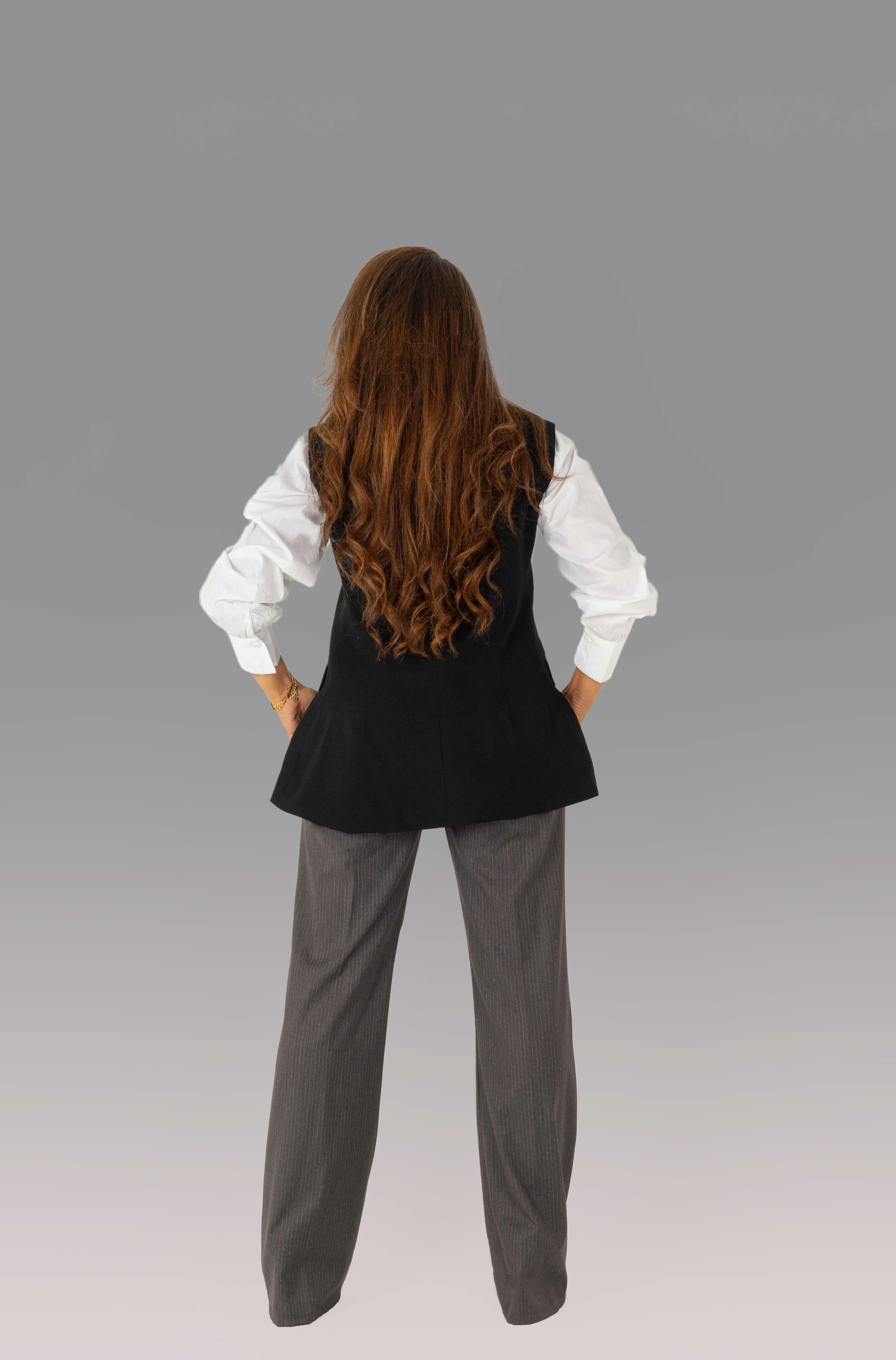 Sleek black long vest with a sharp tailored cut — a bold, versatile piece for modern business and evening looks